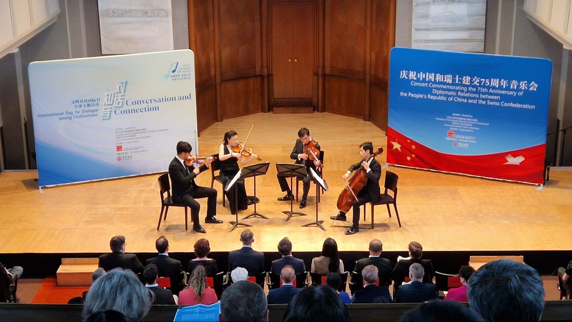 Die Schweizerisch-Chinesische Tibetische Handelskammer (SCTCC) fühlte sich sehr geehrt, an dieser besonderen Veranstaltung zum Thema internationaler Austausch und Dialog teilzunehmen. Wir sprechen unserem herzlichen Dank an unseren gastfreundlichen Gastgeber, Herrn Mao Jun, Geschäftsträger der Botschaft der Volksrepublik China in der Schweiz, aus! In einer warmen und freundlichen Atmosphäre bot die Veranstaltung eine inspirierende Plattform für internationale Zusammenarbeit, die auf Offenheit, gegenseitigem Respekt und gemeinsamer Vision beruht. Das China Symphony Orchestra’s Forbidden City Quartet führte mehrere klassische Werke sowohl aus der chinesischen als auch der westlichen Musik, darunter Liang Shanbo und Zhu Yingtai sowie Beethovens Streichquartett Nr. 4, auf und erhielt anhaltenden Applaus vom Publikum.